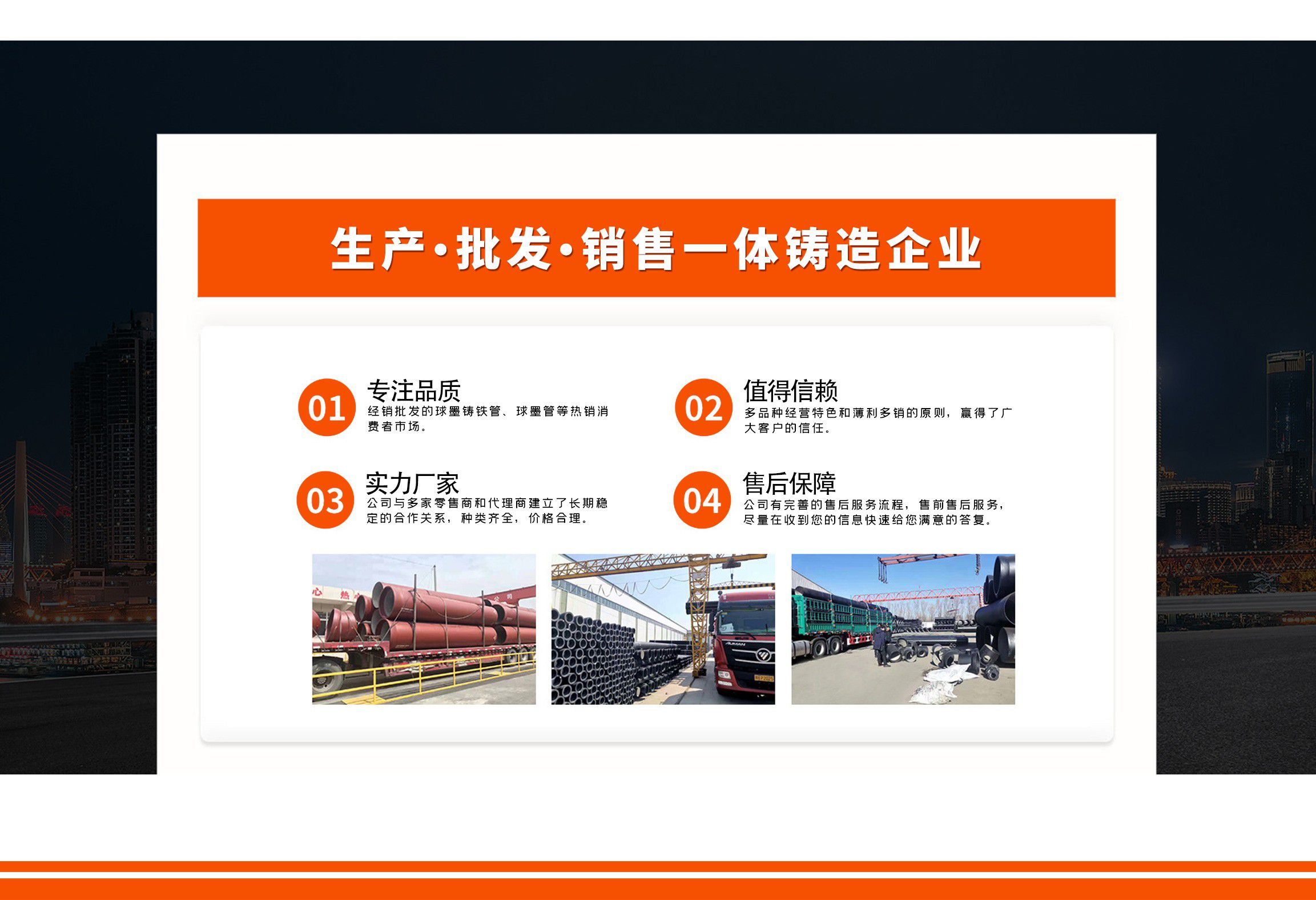 青島金源達管業有限公司主要經營各種規格球墨鑄鐵管,球墨管,球墨鑄鐵管廠家等產品,質量可靠,誠信經營,值得信賴!  青島金源達管業有限公司始終堅持“誠信立業,追求卓越,合作共贏,共同發展”,竭誠歡迎各界朋友來廠參觀指導,洽談業務。我們愿與您攜手共進,互惠雙贏,共創未來!  公司堅持“以奮斗者為本”的理念,關心關愛職工,職工的獲得感、幸福感更加充實、更有保障、更可持續;秉承“忠誠企業、勇于擔當、開拓創新、主動作為”,堅持黨建領航、創新驅動、文化塑魂、奉獻社會,全面致力于綠色、低碳、高效、高質量發展。  愿與各界朋友攜手并進,共創未來!...